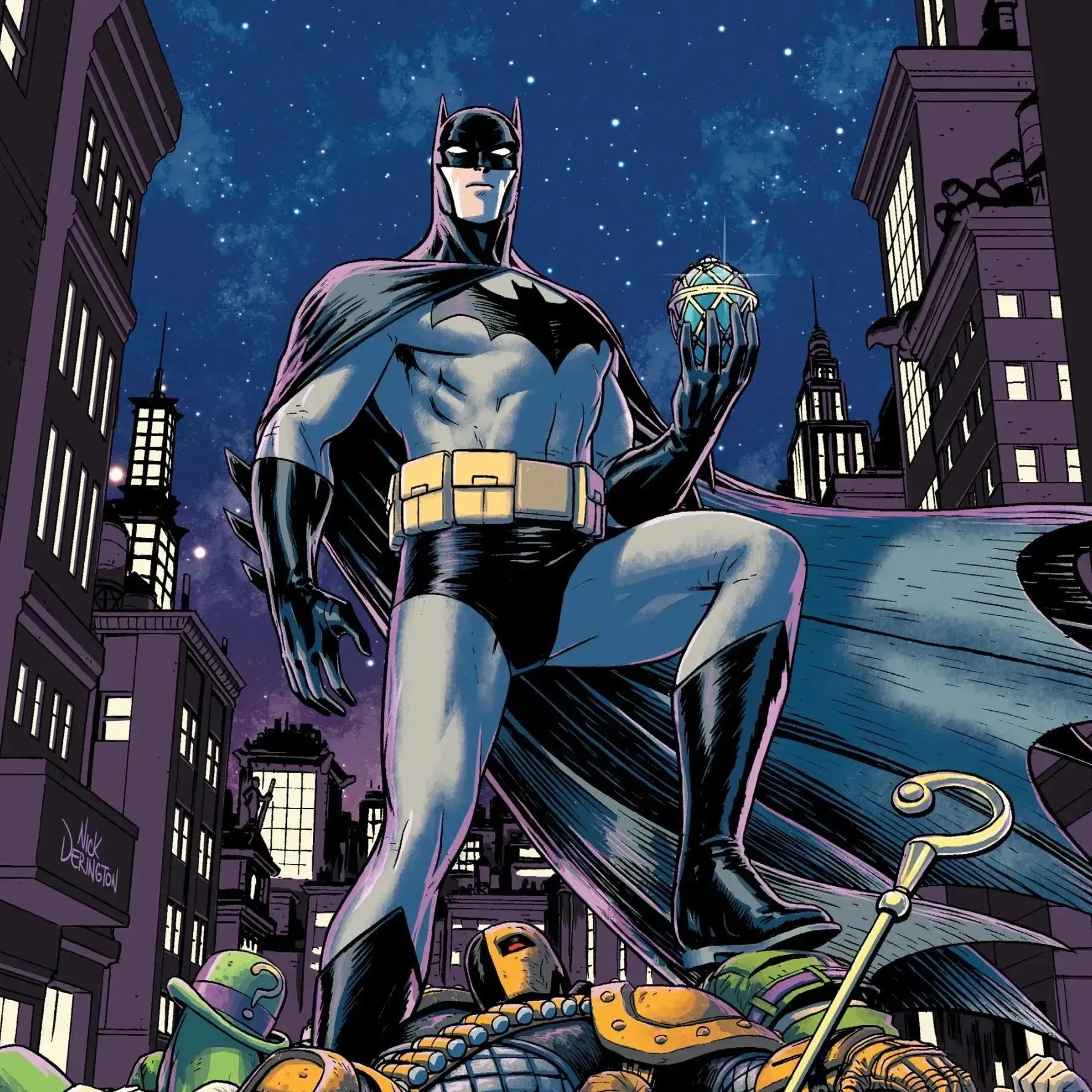 Na krovu Gothama Batman promatra poražene robote. „Još jedna noć, još jedna hrpa starog željeza,” promrmlja, stišćući svjetlucavi artefakt. Smije se: „Riddlerov štap večeras nikome ne prijeti.” S odlučnim skokom nestaje u tami, spreman otkriti tajne artefakta i zaustaviti novi zločinački plan.