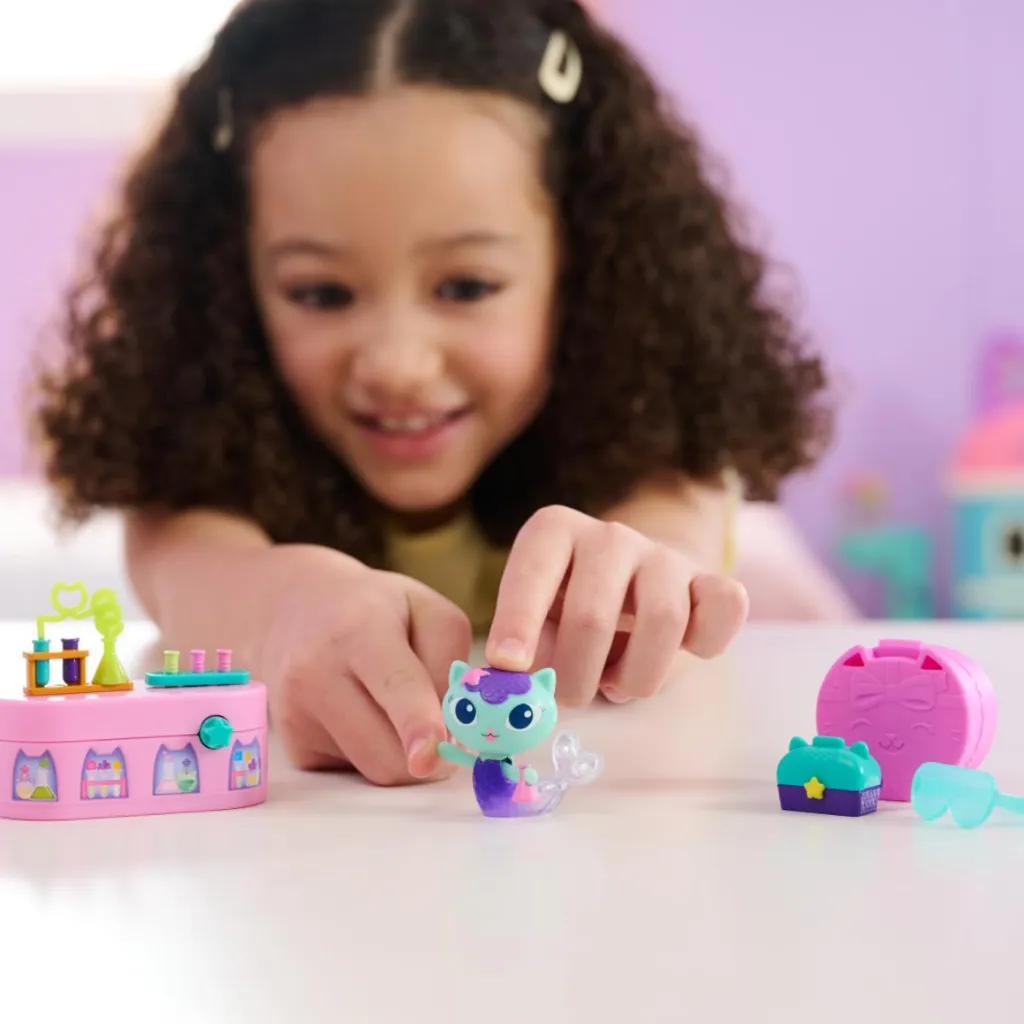 Ovaj set dovodi MerCat iz Gabbyne čarobne kuće ravno u tvoje ruke, s njezinom sjajnom glavicom koja se njiše i iznenađenjem u obliku laboratorijskih naočala. Pritisni zvjezdicu na stolu i gledaj kako epruvete skaču gore-dolje, pa svaka igra postaje znanstvena pustolovina. Djeca smišljaju priče, izvode pokuse i osjećaju se kao u crtiću.