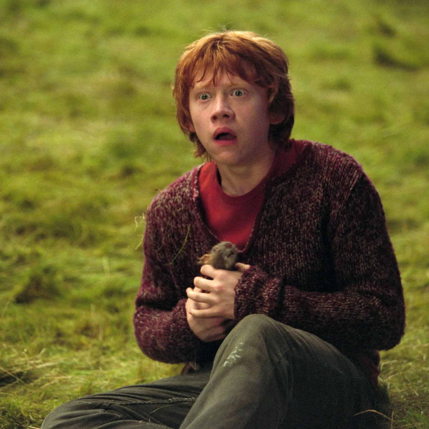 Na travnjaku Hogwartsa Ron grčevito drži Šugavka, oči širom otvorene. „Ajme, Šugavko, jesi li čuo to? Nadam se da nije opet neki divovski pauk!” Štakor nervozno trza. „Ron, opet ćeš bježati?” zove Hermiona. Ron proguta knedlu: „Samo ako pauci počnu pjevati!” Zajedno kreću tražiti Hagridovu izgubljenu bundevu na rubu Zabranjene šume.