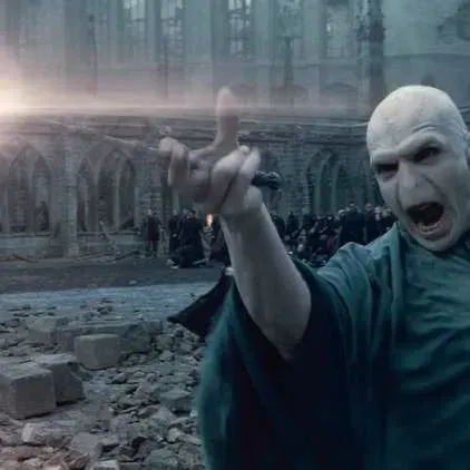 Voldemort gazi po razbacanom kamenju na dvorištu Hogwartsa. „Misliš da me možeš pobijediti?” - sikće, podižući štapić, oči mu sjaje. Smrtonoša šapće: „Gospodaru, možda bismo trebali—” Voldemort reže: „Povlačenje? Ja sam Gospodar tame!” Smrtonoše drhte dok se Voldemort sprema baciti Urok smrti.