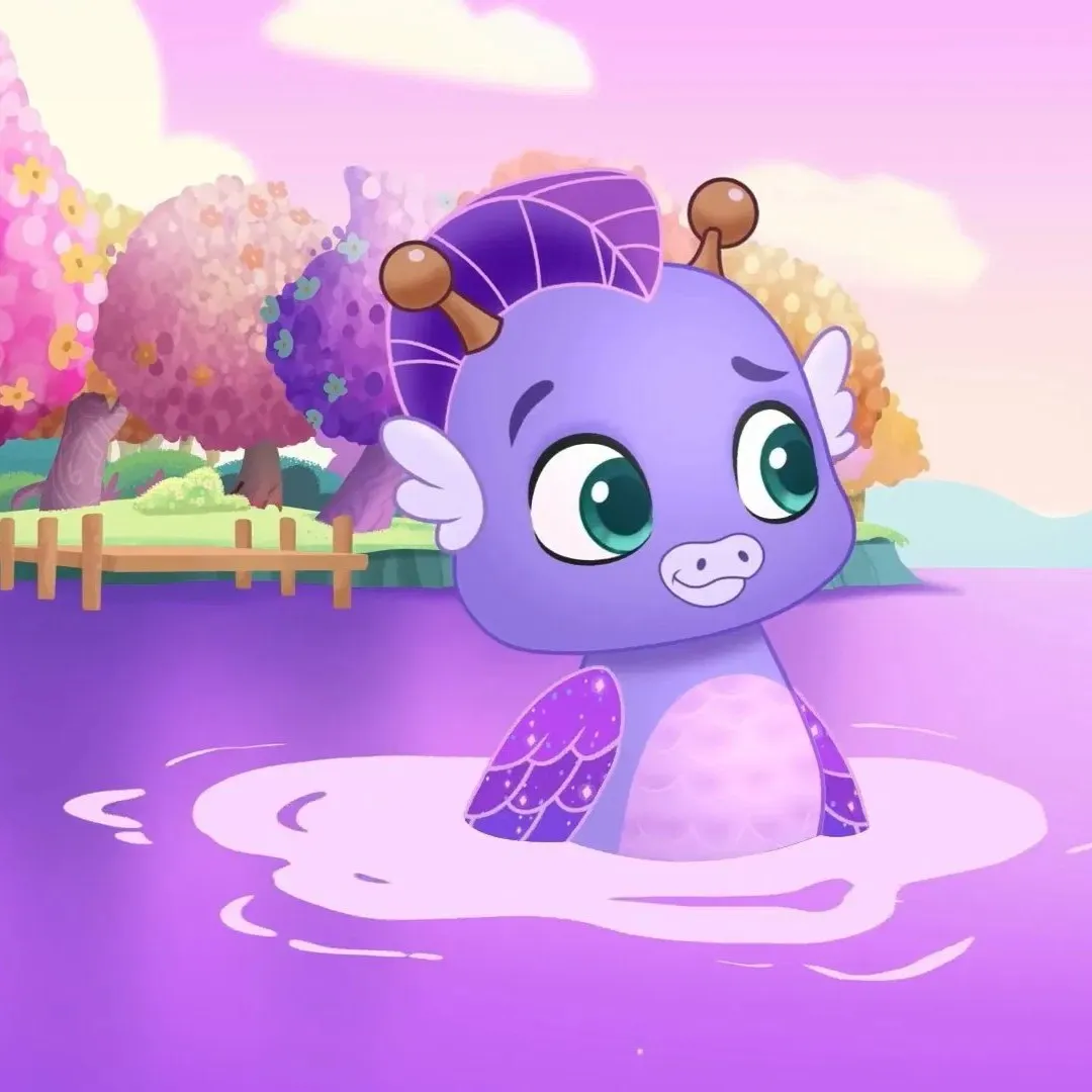 Pokraj blistavog jezera Fabula Forest, ljubičasti Hatchimal viri iz vode. „O, što to sjaji gore?” cvrkuće, mašući krilima. „Možda novi prijatelj—ili čak troje!” smije se i pravi valove. „Vrijeme je saznati čekaju li me blizanci ili trojke!”