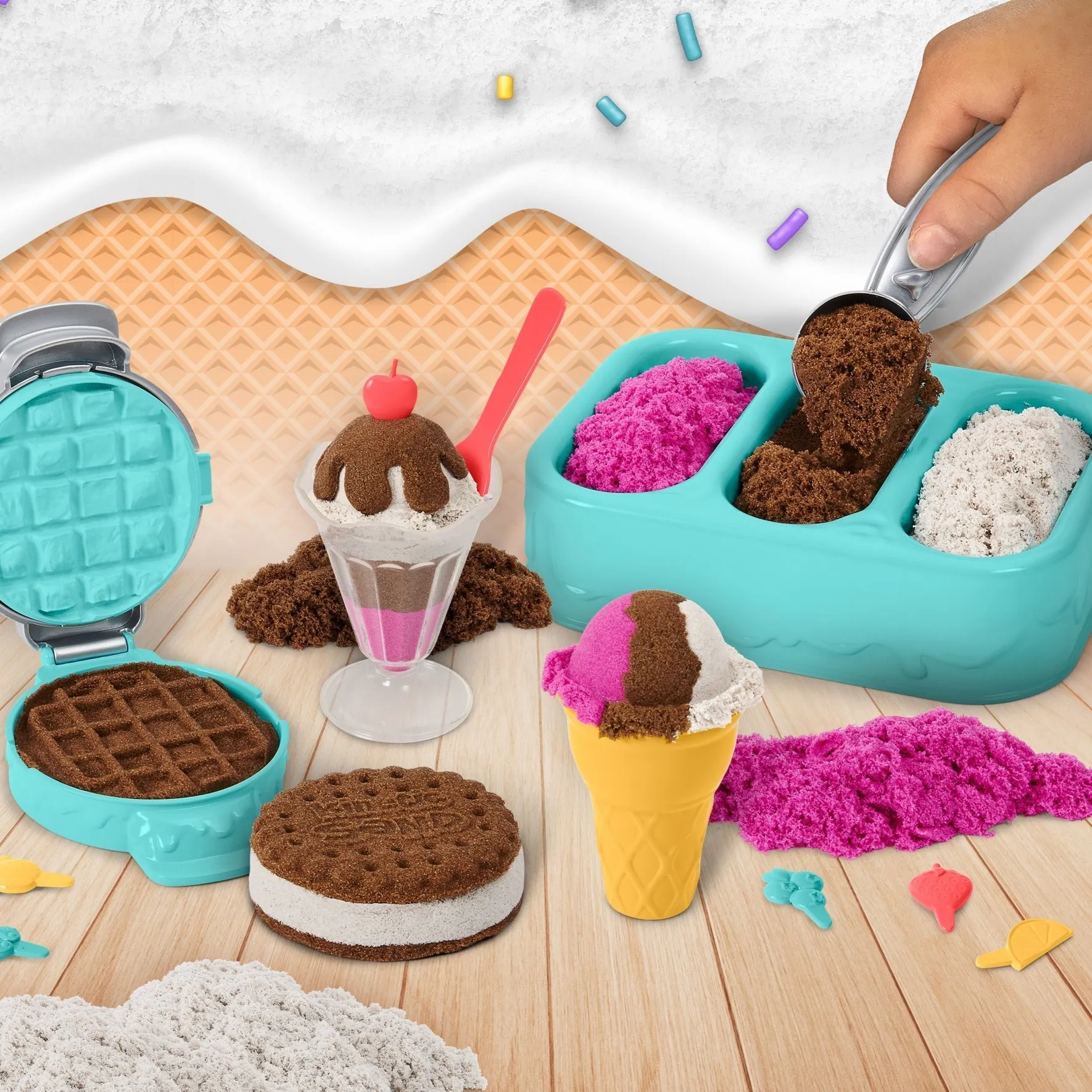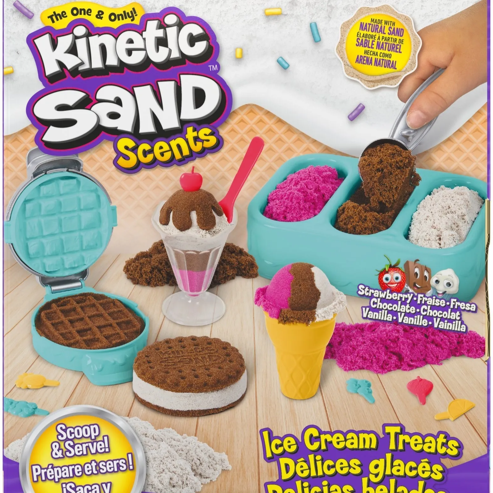 Kinetic Sand set za mirisni sladoled omogućuje djeci izradu korneta, kupova i sendviča od tri mirisna, šarena pijeska. U kompletu su alati poput žlice, preše za vafle i čaše za beskrajnu kreativnu igru. Svaki desert izgleda i miriše kao pravi, potičući osjetila i maštu.