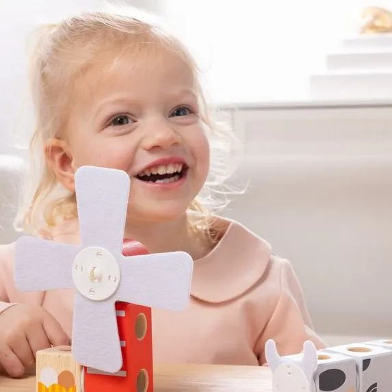 Gradimo šareno seosko dvorište, vrtimo vjetrenjaču i slažemo životinje za igru kazališta. Meki filc i glatko drvo oduševljavaju sva osjetila.