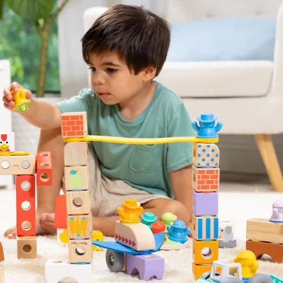 U svijetloj igraonici Ivan spaja dva drvena bloka. „Gledaj, napravio sam patku s kapom!” smije se. Prijateljica Mia dodaje filcane rogove: „Moja je koza sa supermoćima!” Uz smijeh vrte vjetrenjaču. „Izgradimo najvišu štalu prije užine!” kaže Ivan, spreman za veliko slaganje.