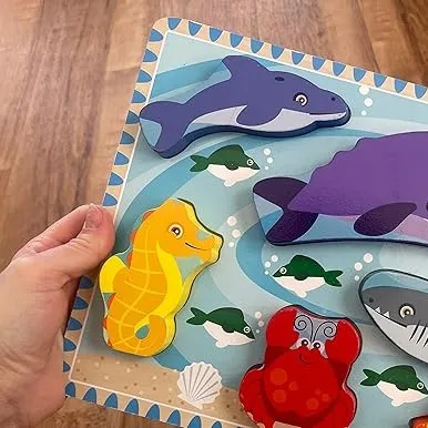 Ovaj drveni set slagalica donosi čuda mora uz četiri prekrasno ilustrirane životinjske slagalice. Svaka slagalica ima sedam debelih dijelova, savršenih za male ruke. Vesele slike i čvrsta drvena kutija omogućuju igru kod kuće ili na putu, a slagalice se mogu slagati iznova i iznova.