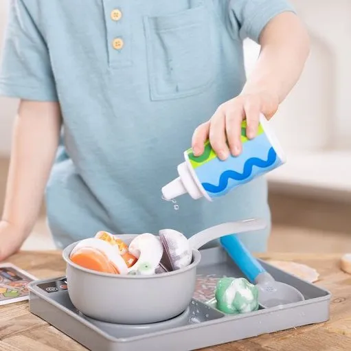 Melissa & Doug Water WOW kuhanje s vodom omogućuje djeci da kuhaju šarena jela samo kapljicom vode. Lonac, žlica i hrana koja mijenja boju uvode djecu u svijet kuhanja, gdje mogu pirjati, pržiti i kuhati na pari. Set potiče beskrajnu maštovitu igru i stvaranje vlastitih priča u kuhinji.