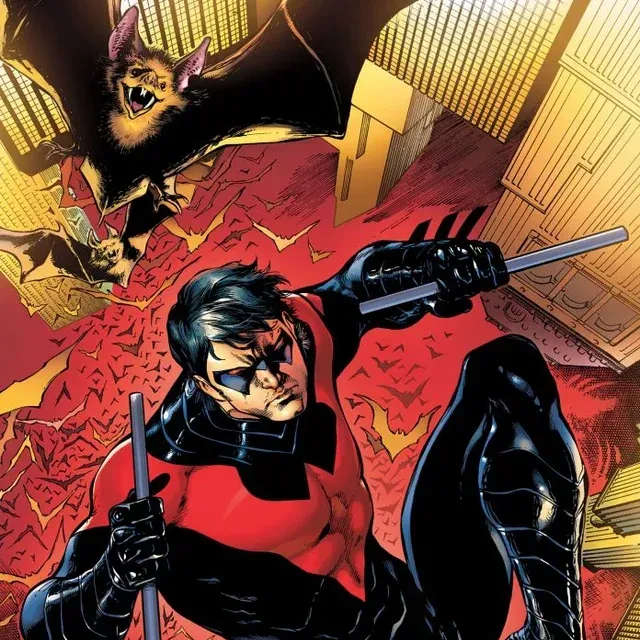 Na krovu gothamskog nebodera pod zlatnim svjetlima Nightwing drži svoje palice. „Posvuda šišmiši - valjda mi navijaju?” šali se. Jedan šišmiš proleti nisko, Nightwing se nasmiješi: „Ili me upozoravaju!” Odlučno skače: „Vrijeme je zaustaviti Black Maska u muzeju. Gotham računa na mene - bez pritiska!”