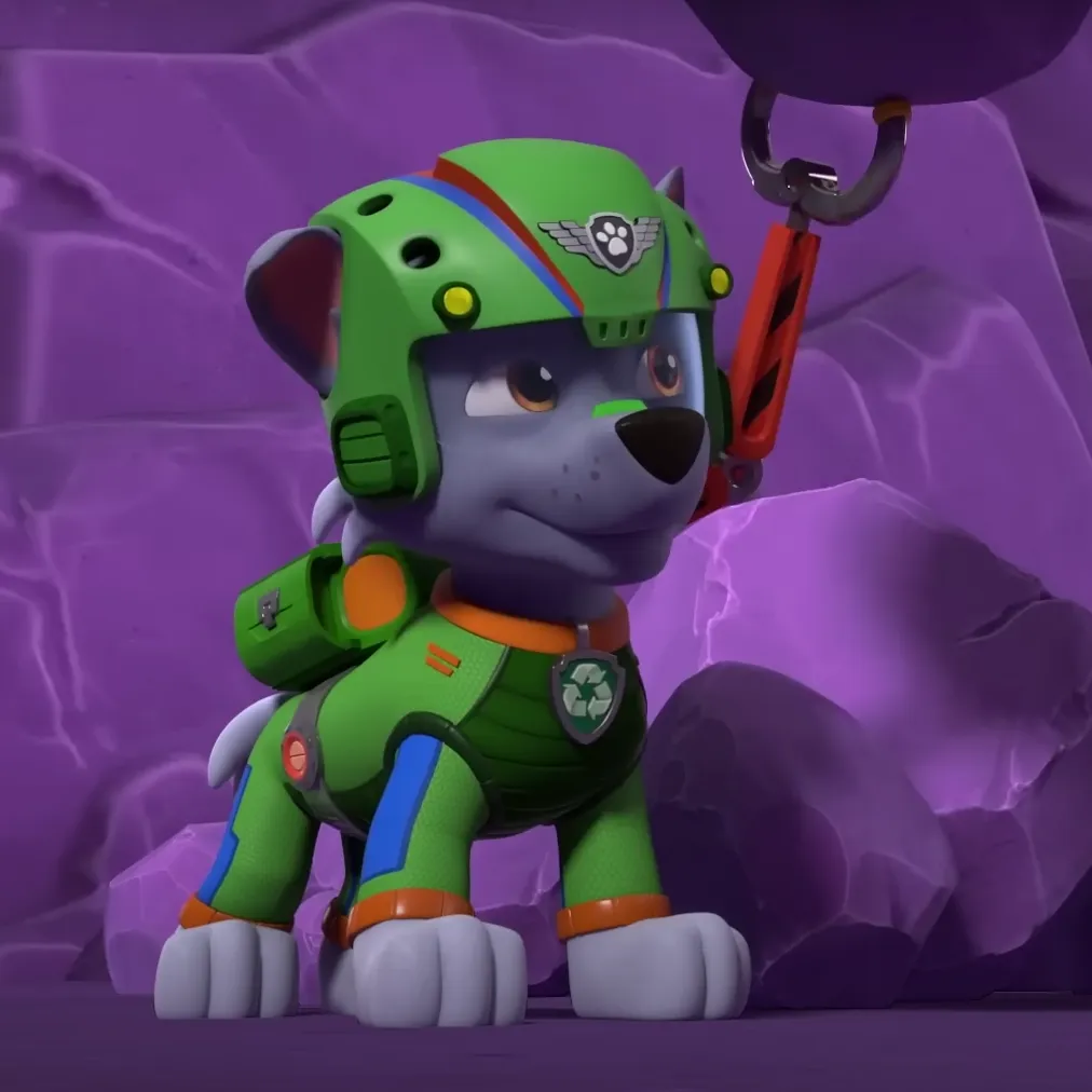 U špilji s ljubičastim stijenama Rocky proučava svoj mehanički kuk. „Ova stijena nema šanse protiv Rescue Wheelsa!” kaže. Kamenčić padne—Rocky se nasmije: „Ups, uzdrmao sam cijelu špilju!” Prilagođava kacigu. „Oslobodimo prolaz i spasimo kokicu Chickalettu iz tunela—nema stijene koju štene ne može svladati!”