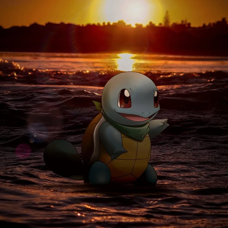 Na obali Squirtle popravlja zeleni šal i smiješi se. „Spreman za valove danas?” veselo se zapljuskuje. „Pazi da se ne smočiš previše, Squirtle!” Squirtle namigne: „Ne obećavam ništa! Bit ću najbrži plivač.” Odlučno kreće preko zaljeva tražiti skriveni Vodeni kamen.