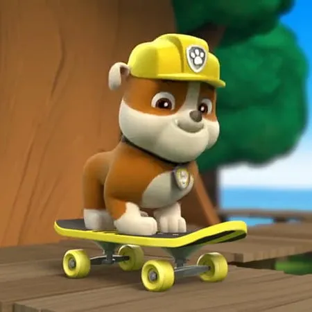 Na drvenoj rampi ispred sjedišta Builder Covea Rubble se samouvjereno smiješi na skateboardu. „Gledajte, ekipo—sad vozim u stilu!” Mix se smije: „Samo nemoj spljoštiti rampu, Rubble!” Wheeler bodri: „Ajmo, Rubble!” Rubble namigne: „Sljedeća postaja: raketna platforma. Tko se vrti sa mnom?”