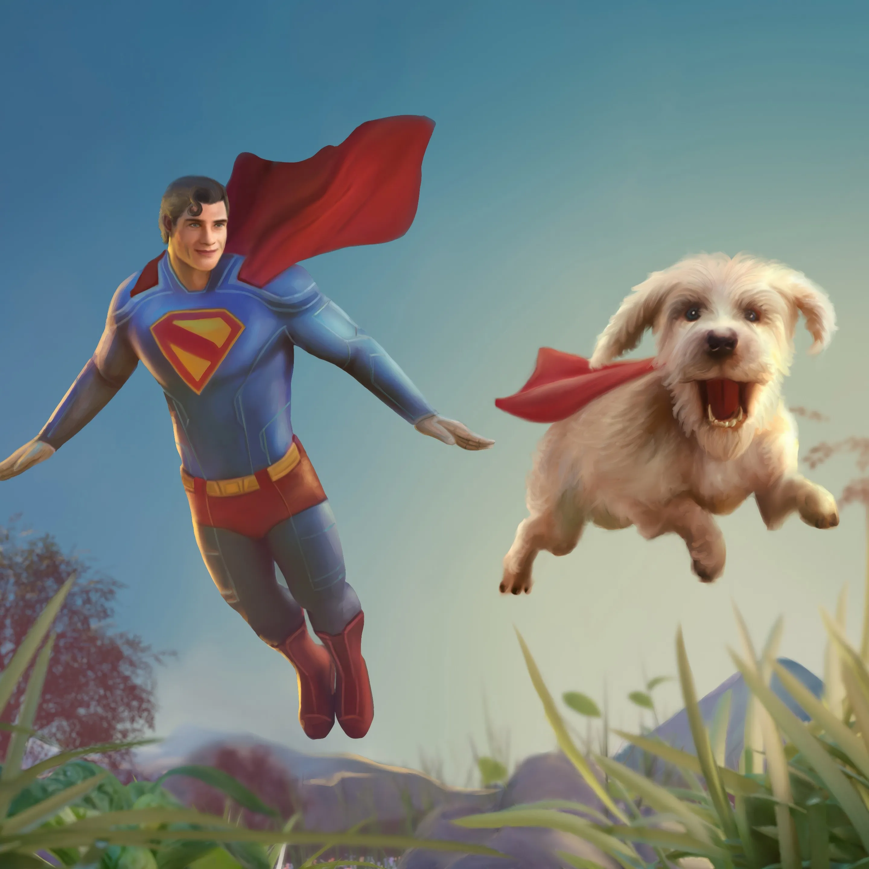 Visoko iznad zelenih polja kraj Metropolisa Superman se smiješi dok Krypto veselo maše repom uz njega. „Krypto, utrka do grada!” zove Superman. Krypto laje: „Dogovoreno! Ali bez superbrzine!” Superman se smije: „Obećajem!” Zajedno lete prema Metropolisu zaustaviti Lex Luthorove robote.