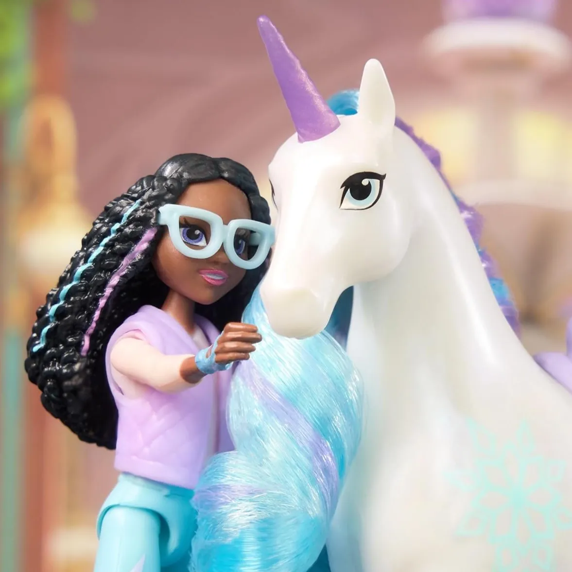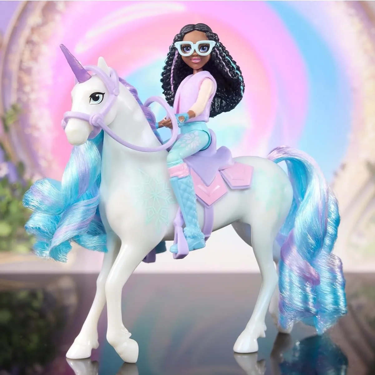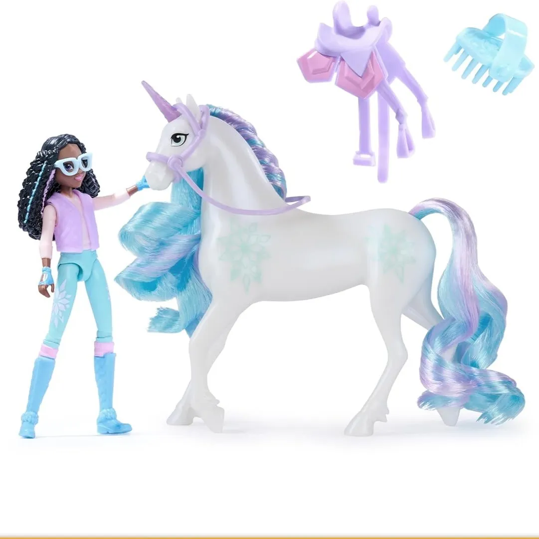 Set figurica Layla i Glacier iz Unicorn Academy vodi djecu u čarobne avanture inspirirane Netflix serijom. Layla ima sedam zglobova pa je možete posjesti na Glacier s blistavom, češljanom grivom i ledenim oznakama. Odvojivo sedlo, uzda i četka potiču beskrajnu igru uloga i maštanja.