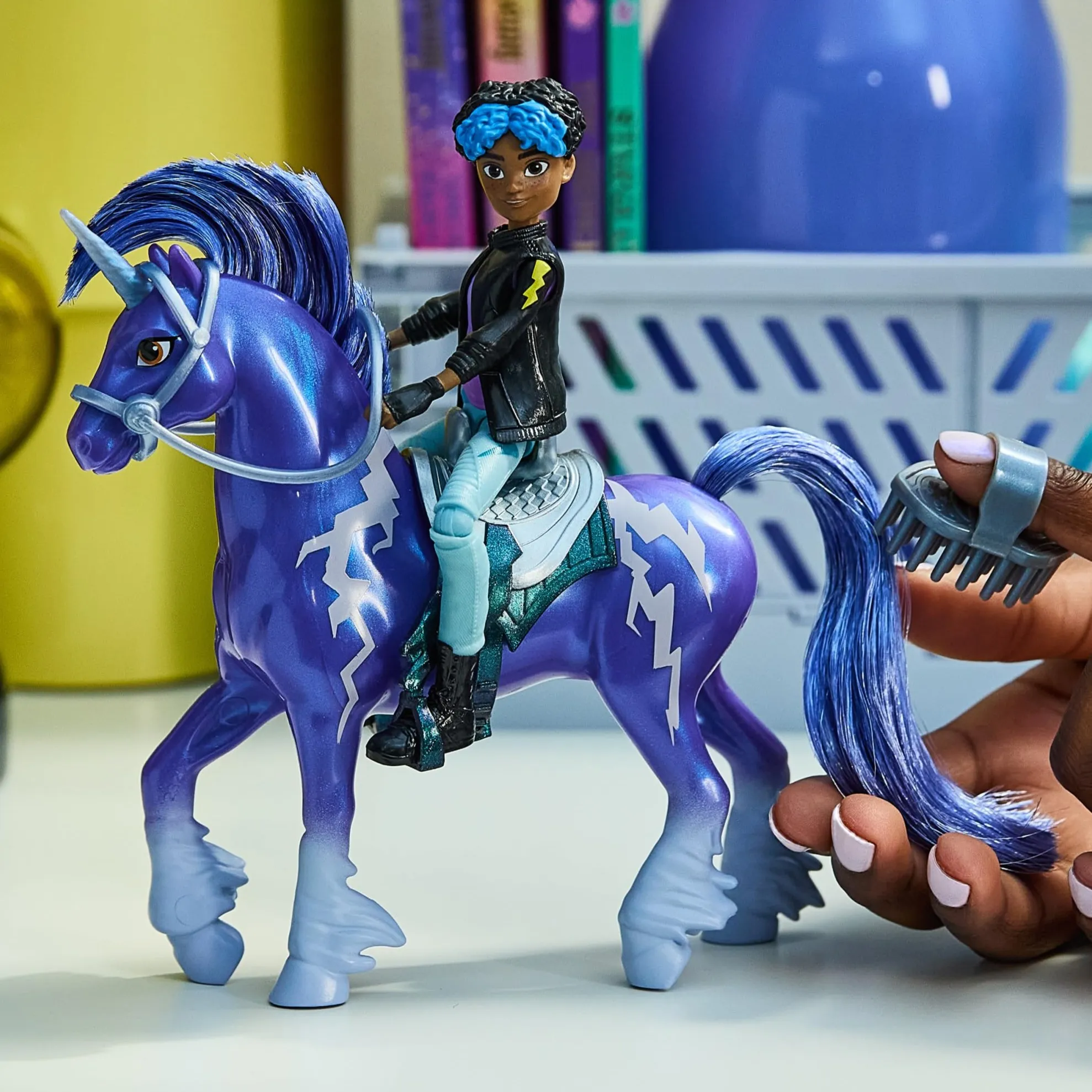 Set Unicorn Academy Rory & Storm donosi čaroliju Netflix serije ravno u dječje ruke. Rory, vesela šaljivdžija, i njezin divlji jednorog Storm s magijom vremena potiču pričanje priča i prijateljstvo. S pomičnim zglobovima Rory i češljanjem Stormine grive djeca mogu smišljati vlastite avanture ili ponavljati omiljene scene s čarobnog otoka.