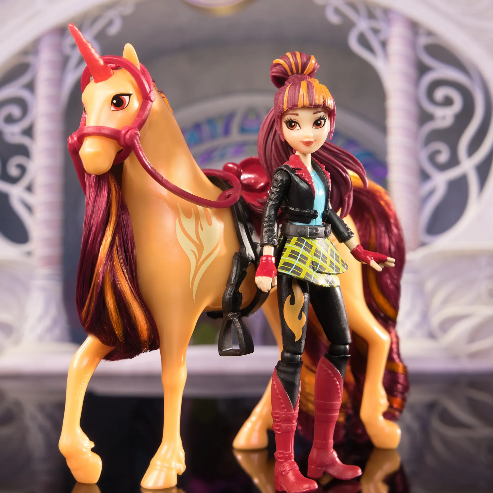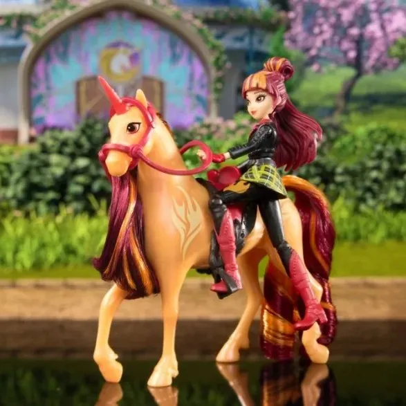 Ovaj Unicorn Academy set donosi Valentinu i njenog vatrenog jednoroga Cinder spremne za čarobne avanture. Valentinom se može upravljati u sedam poza, a jaše Cinder uz pomoć uklonjivog sedla i uzde, što djeci omogućuje stvaranje vlastitih priča. Češljanje crveno-narančaste grive i repa čini brigu o jednorogu još zabavnijom.