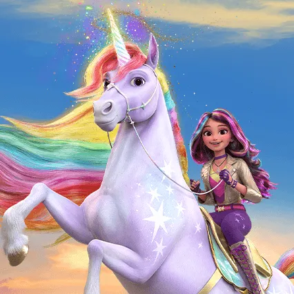 Na blistavoj livadi Otoka jednoroga Sofija sjedi čvrsto na Stormu. „Spreman za još jednu ludu vožnju?” Storm struže kopitom, griva mu sjaji. „Samo nas opet ne odvedi u jezero!” Sofija se smije: „Dogovoreno—samo prati zvijezde.” Zajedno kreću osvojiti legendarni Kristalni labirint prije zalaska sunca.