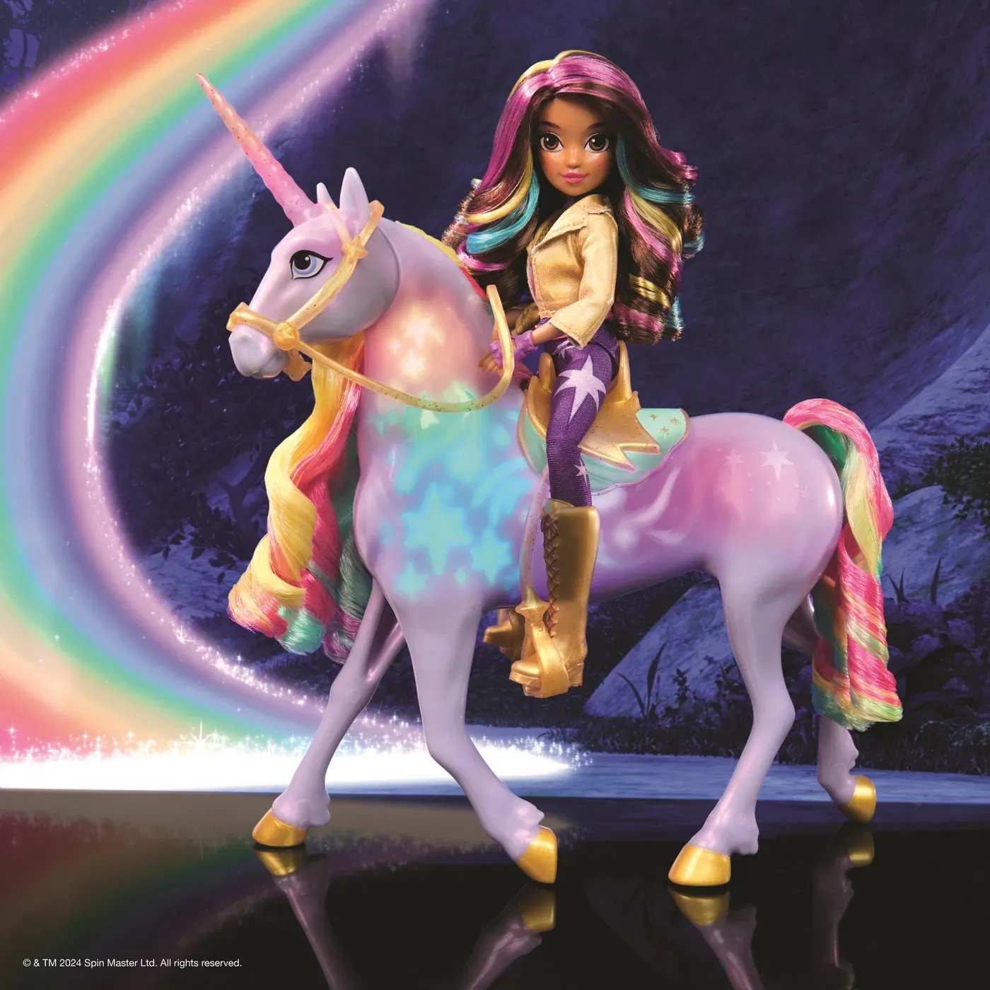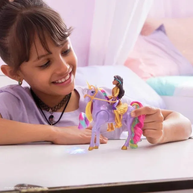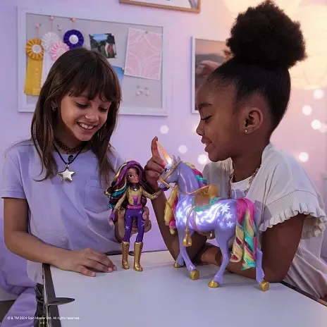 Unicorn Academy svjetleća Wildstar i Sophia set donosi magiju Netflix crtića u vaš dom. Wildstar svijetli duginim bojama i svira glazbu kad joj dodirnete lice ili rog, a povlačenjem uzdi čuju se zvuci galopa. Sophia može jahati Wildstar, što djeci omogućuje da prožive čarobne pustolovine iz crtića.